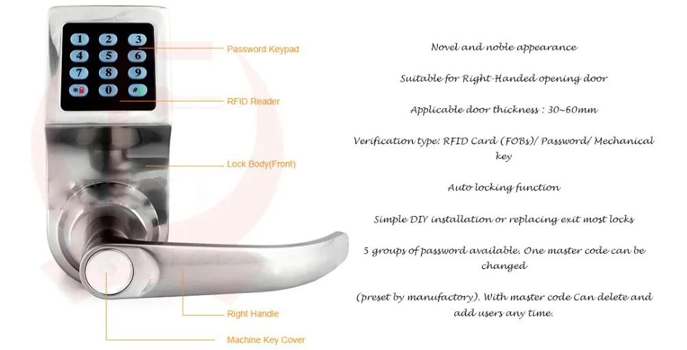 Introduction This is a new Digital keyless password door lock which also has RFID card reader function. The unique card reader design provides great convenience for the elder and young family members as well as office staff who have cards already. This door lock also offers great convenience of reliable keyless access by password. User can setup 56 different 6digit password/ codes for access. If needed, user can still use the 2 backup keys included in the package to open the lock.