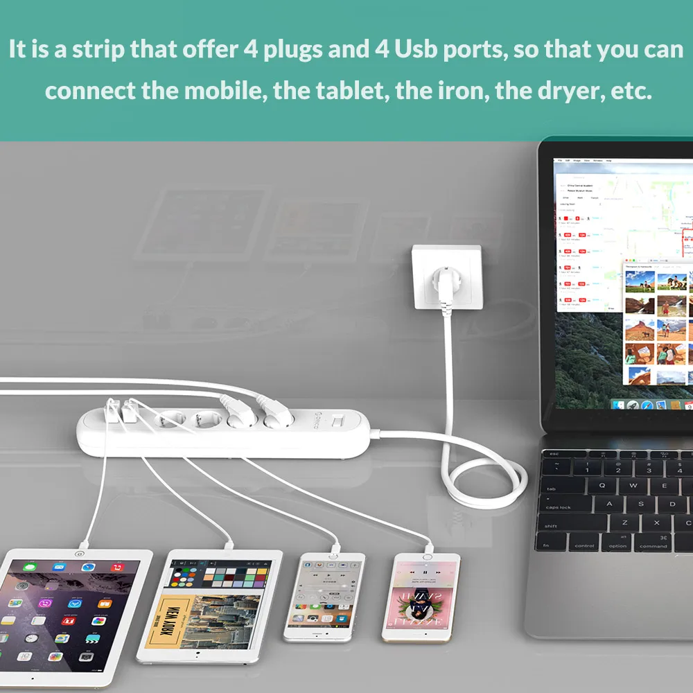 | Description | ORICO Smart USB Power Strip Socket EU Plug Overload Switch Surge Protector 4 Outlet with USB Charger 4 Ports-1.5M Power Cord